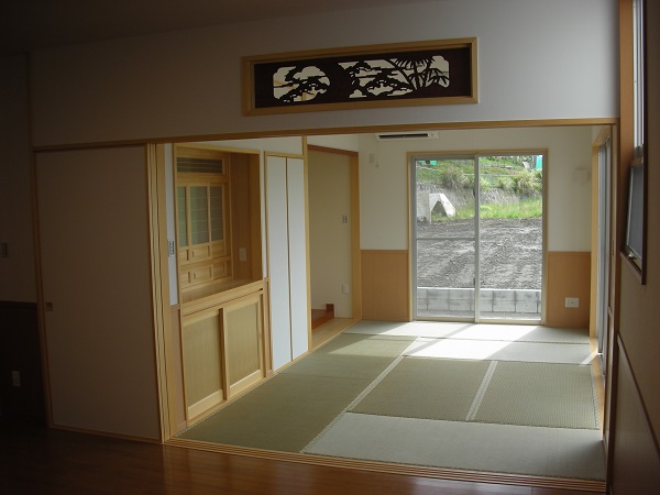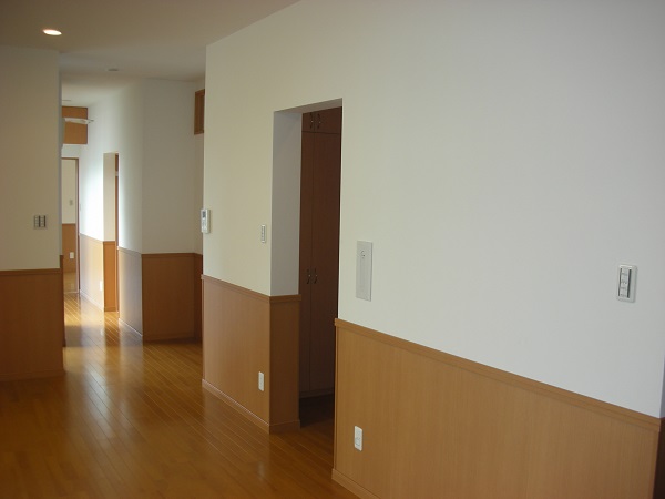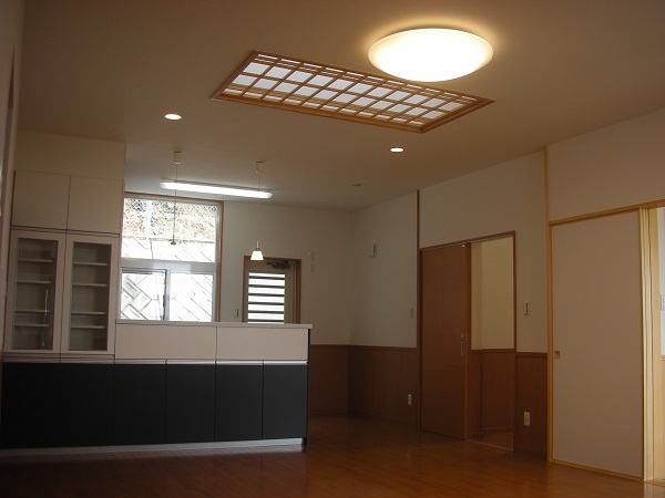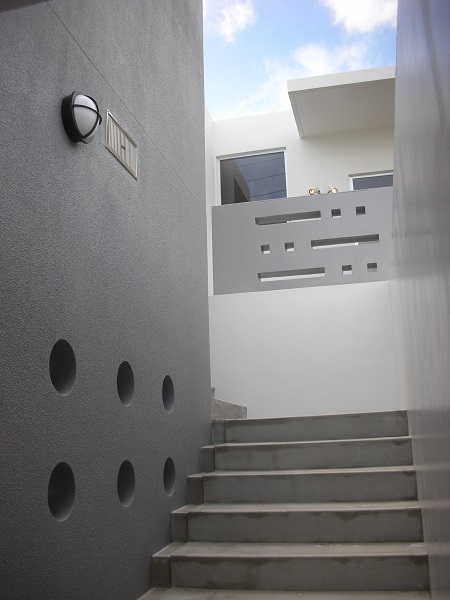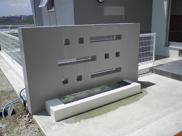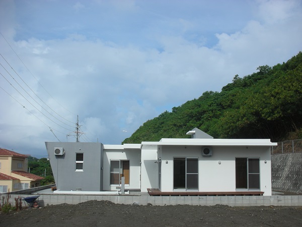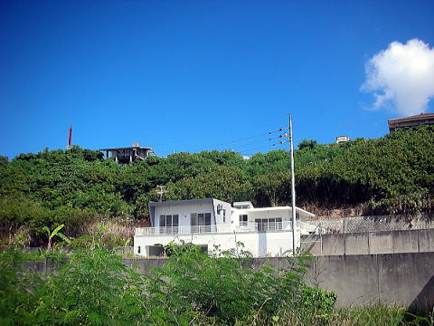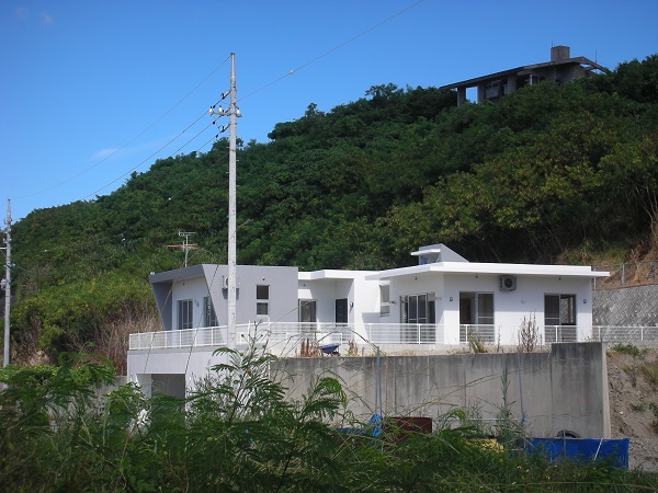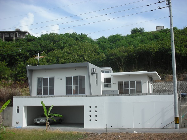 □ 道路沿いの堀車庫の上部にある、平屋の住宅です。 写真にはありませんが、後日、お伺いしたところ、ヤシの木が植えられた庭とこの住宅 が、あまりにもマッチしていて、庭の存在の素晴らしさを痛感しました。農業をされて いるクライアントに脱帽です。 □ 水のヒンプン 車庫から、外部階段で上がっていくと、水が流れ落ちるヒンプンがあります。 水の音が聞こえ、この暑い沖縄、ひと時の涼しさと安らぎで、私達を迎えてくれました。 □ 腰壁のある空間 クライアントのご希望で、腰壁のある空間を創りました。トップライトや外部から差し 込む「光」に包まれて、「白壁」と「木の腰壁」が、『安らぎのある空間』となり、 美しい庭と連続して『住み手の優しさを感じる住宅』へ成長していました。 □ 2009年 鉄筋コンクリート造 平屋 沖縄県豊見城市