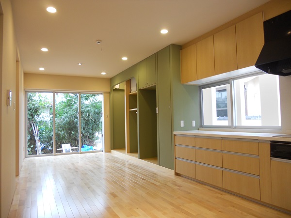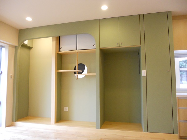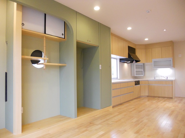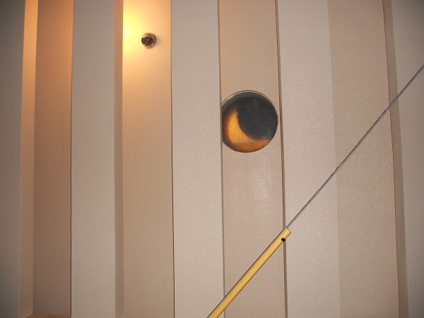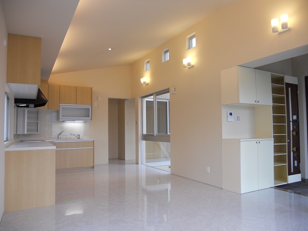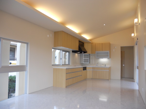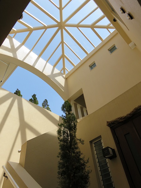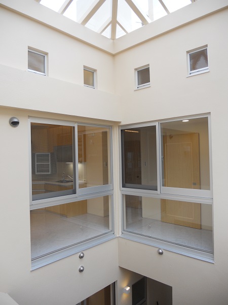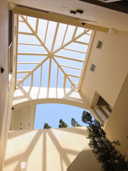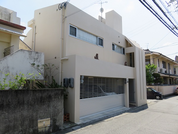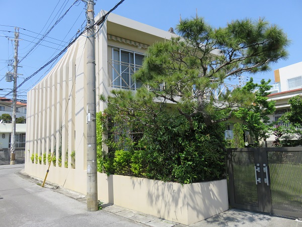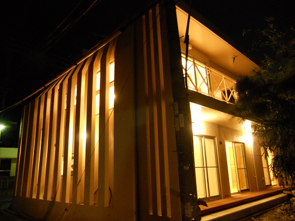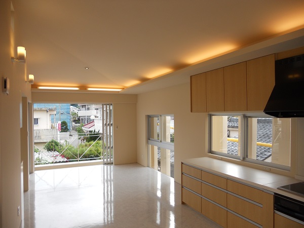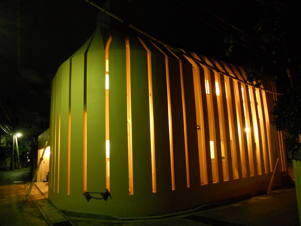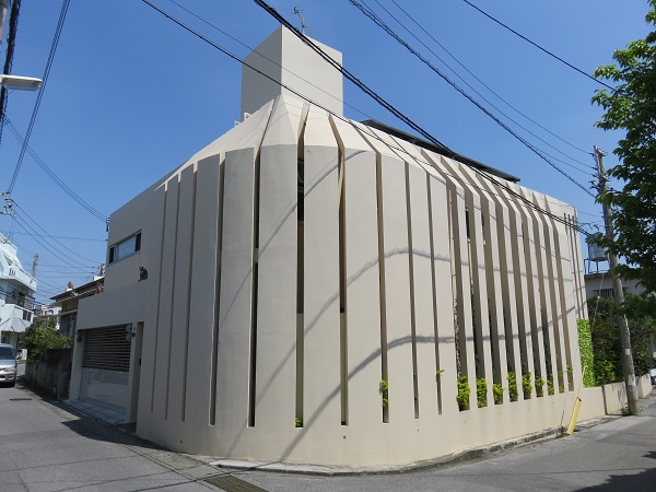 □ 1階と2階を外部階段で繋ぐ「二世帯住宅」です。 2階のクライアント御家族の御自宅は、『白い空間』で、昼は、モダンで、夜は、間接 照明により、柔らかで暖かな空間に変化します。 1階の御両親の御自宅は、『木の空間』で、安らぎのある佇まいになっています。 クライアントのアイディアで、床の間にある三日月は、半月・満月にも変化します。 □ PATIO 外部階段室を兼ねる『パティオ(中庭)』は、1階2階へアプローチする分起点であり、 透明な屋根からは、自然光が降り注ぎ、空の色や季節を伝えてくれます。 また、外部空間であるパティオですが、各階の窓からお互いの住戸が見え、プライバシー を保ちながら、家族のけはいを確認できます。 □ BLIND この住宅の最大の特徴は、外観です。 この住宅は、角地にあり、建て替え前から、外部からの視線や、夕方の西陽対策が、課題 のひとつでした。クライアントと共に考えた『スリットグラデーションのBLIND』は、こ の住宅の顔になり、照明設置位置の工夫で、夜も印象的な外観を見せています。。 □ 2011年 鉄筋コンクリート造 2階 沖縄県那覇市
