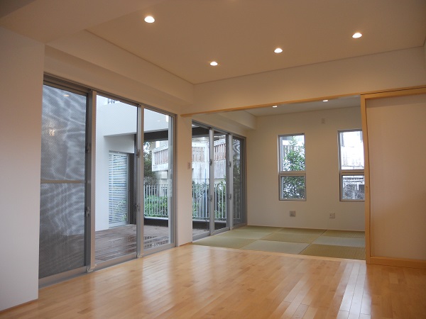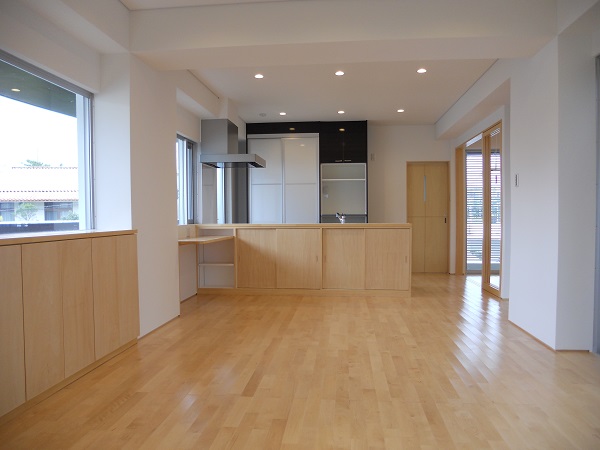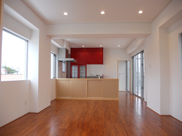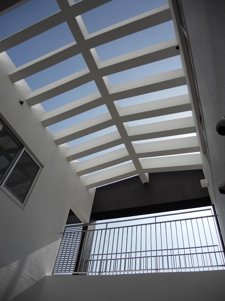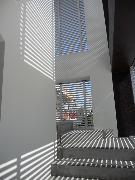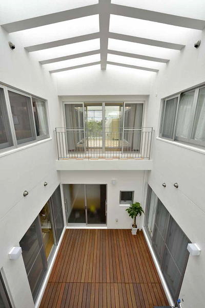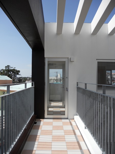 □ クライアント御夫妻には、4人の娘様御家族がおり、週末や正月、お盆に訪れる時に、 この住宅街の中で、『気兼ねなく楽しく集える家』を、御希望されました。 □ 1階が、ピロティ形式で、充分な駐車台数の確保、また、御主人の書斎兼娘様御家族の 宿泊室を離れとして、計画しました。2階は、クライアント御夫妻の家、3階は、末娘 御家族の家を、外部階段で繋ぐ構成になっています。 □ 私達は、3層に積まれたキューブの2階へ、『吹き抜けのあるウッドデッキのパティオ』 3階に、『タイルデッキのパティオ』を建物の中心部に挿入し、この住宅街の中で、『気 兼ねなく楽しく集える家』として、提案しました。パティオ(中庭)に開いた家ですが、 両方のパティオとも、屋根から、自然光が降り注ぎ、空の色、季節の色を感じながら、明 るく風通しの良い住環境装置として、機能しています。また、上下階の適度なプライバシ ーの距離を保ちながらも、コミュニケーションの場であり、娘様御家族が集まった時、楽 しく過ごせる「屋外のリビング」にもなっています。 □ 2014年 鉄筋コンクリート造 3階 沖縄県糸満市