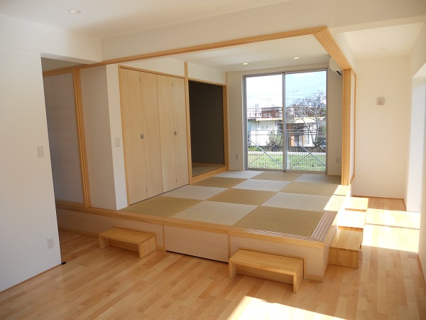 この家は、和室に大きな仕掛けがあります。まず、一段上がった和室に、上り下りが楽な「可動ステップ」