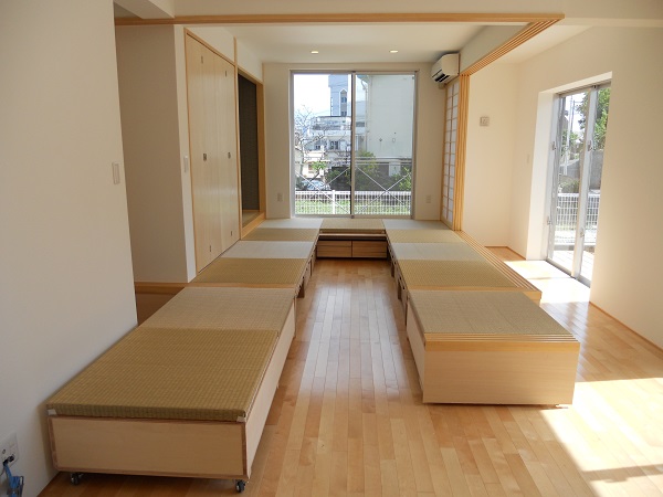 を設置したこと。次に、高齢者が多く集まるので、オリジナルな「可動畳」を創り、それらを二列に配置し、