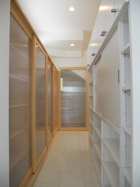 この収納棚は、両面から使用できます。二列目の収納スペースは、半透明の引き戸で閉じられた奥行きのある
