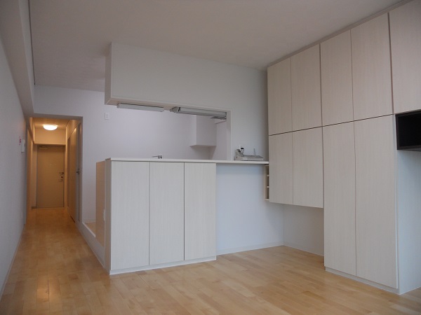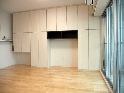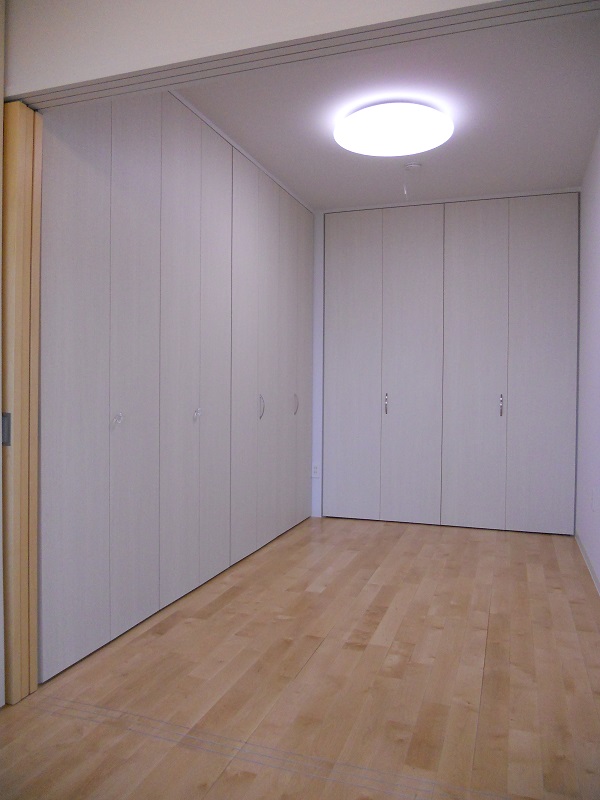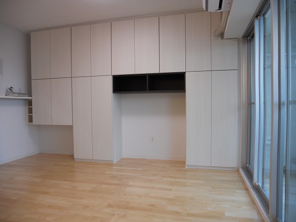 □ マンション一室の、全面リフォームです。既存住居では、足りなかった「収納量を充実した住まい」を 求められました。 □ 両隣住戸側の壁に、それぞれ居室の目的に適した収納壁を配置しました。収納扉の材質・色を統一し、 調和のある、シンプルで、明るい空間に仕上げました。 □ 2014年 鉄筋コンクリート造マンションの一室 沖縄県浦添市