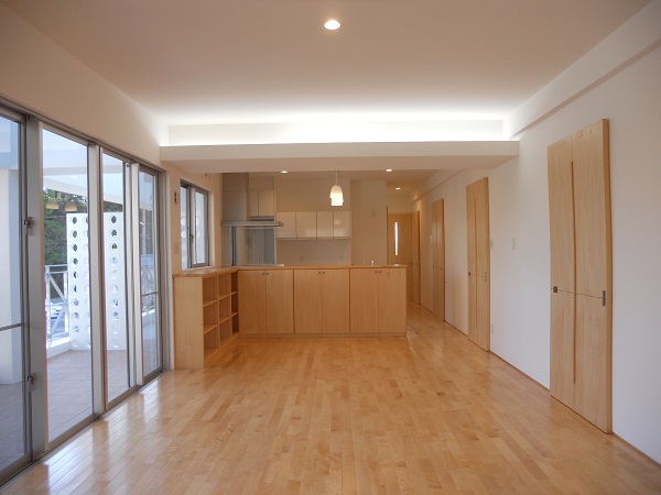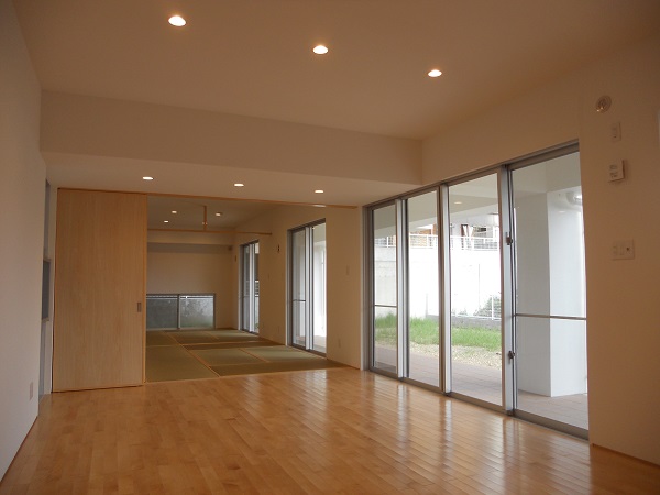 しました。また、各部屋から庭への掃き出し窓により、庭を楽しみ、視覚的にも広がりのある空間構成と