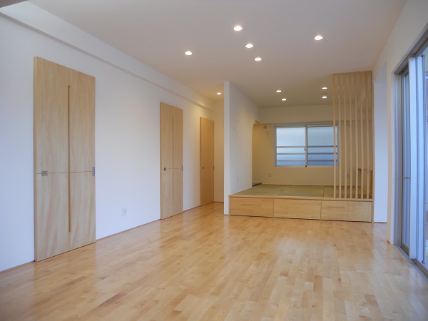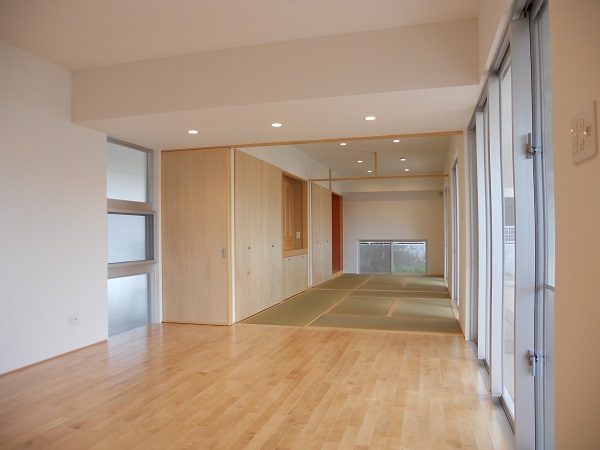 □ 一階は、親せき知人が多く集まるため、「和室の続き間」と「LDK」が直線上に連続する広い空間を確保