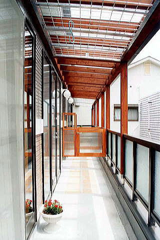 □ この小さな集合住宅は、1999年に建てた『SKY BOX』のひとつ隣の敷地に、存在 します。 クライアントは、この『SKY BOX』のデザインと、施工した建設会社の工事姿勢が、 大変気に入り、御連絡を頂きました。皆で、一生懸命創り上げてる姿を、誰かが見てい て、評価頂けた事に、心から、感謝致しました。 □ 1階:シングルタイプ2世帯+駐車場、2階:ファミリータイプ2世帯の構成です。 □ 2階のファミリータイプは、出来る限り「一戸建て住宅の性能」を目指しました。 二世帯の住戸間に、外部階段を配置することで、一戸建て住宅と同じ、四面外壁を持つ 光・通風の良い健康的な住戸環境を、確保しました。 「前庭のような、オリジナル木製門扉付バルコニー」「バルコニー上部にある木製パー ゴラ」「玄関を兼用する和室前のインナーテラス」「船底天井」等、手づくり感のある デザインが、喜ばれ、クライアントご自身がここに住みたいと、最高なお言葉を頂きま した。 □ 2000年 鉄骨造 2階 鹿児島県鹿児島市