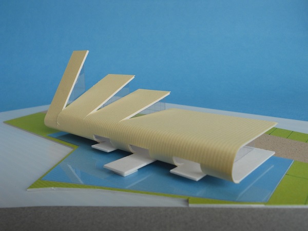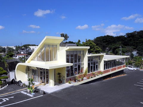 □ 沖縄そば店の老舗「ちらー小」の建て替えです。 □ クライアントは、初代の沖縄そば店らしい建築に対して、二代目は、何か新しいものを望んでおられました。 □ 沖縄そばの面は、平板上に延ばされた面を曲げ重ね、少し太めにスライスし、そば面となります。 二代目ちらー小は、この「製造過程の瞬間」を、建築の形態として切り取りました。 インテリは、琉球松を多用し、また、テーブルは、初代からのをリフレッシュして使用し、初代ちらー小の 記憶を、受け継いでいます。 □ 2013年 鉄筋コンクリート造 平屋 沖縄県南風原町