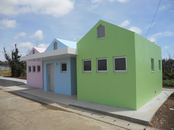 □ それぞれ独立した家型のフォルム(男子用・女子用・多目的)を持つこのトイレは、広大な海と空、緑豊か
